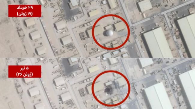 اولین تصویر ماهوارهای که شرکت پلنت بعد از حمله موشکی ایران منتشر کرده، مربوط است به تاریخ ۵ تیر (۲۶ ژوئن). در این تصویر تخریب کامل یک آنتنپوش (ریدوم) دیده میشود.