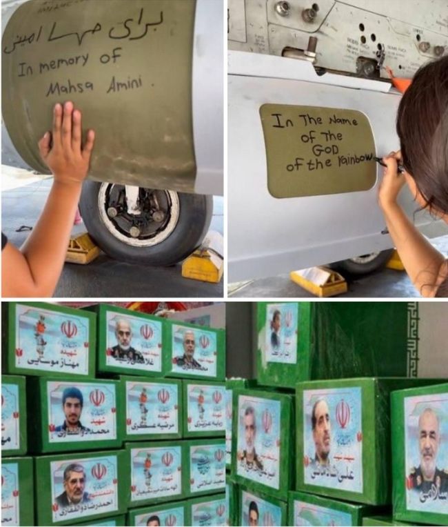 عضو سازمان اف دی دی: یک منبع تصاویری در اختیارم گذاشت که یک تکنسین پرواز زن اسرائیلی را نشان میدهد که بر روی یک مهمات استفادهشده در حمله هوایی علیه ایران، یادداشتی به یاد مهسا امینی نوشته است.پلیس «امنیت اخلاقی» ایران در سال ۲۰۲۲ مهسا امینی را بهدلیل آنچه نقض قانون حجاب اعلام شد، به قتل رساند.
