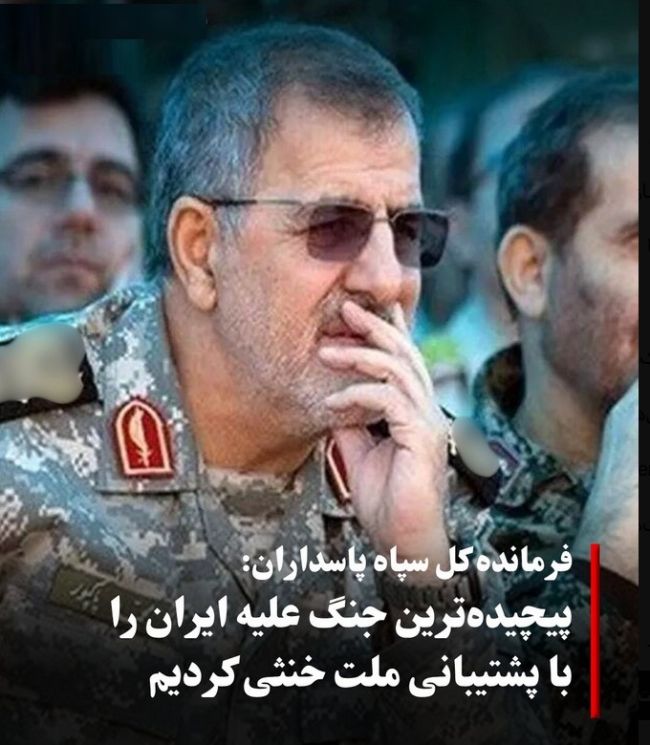 محمد پاکپور، فرمانده کل سپاه پاسداران روز پنجشنبه ۲۶ تیر در دیدار با فرمانده کل ارتش جمهوری اسلامی با اشاره به جنگ ۱۲ روزه، گفت: «نیروهای مسلح جمهوری اسلامی سختترین و پیچیدهترین جنگ و فتنه تاریخ علیه ایران را با پشتیبانی حماسی ملت خنثی کردند.» محمد پاکپور با تاکید بر اینکه «گریبان مهاجمین و متجاوز را رها نخواهیم کرد» افزود: اسرائیلیها در روزهای آخر جنگ، جهنم وعده داده شده را به چشم دیدند. او بر آمادگی نیروهای مسلح جمهوری اسلامی تاکید کرد و گفت: جنگ و نبرد با متجاوزین را از همان نقطهای که توقف پیدا کرد، شروع خواهیم کرد.لاریجانی: مذاکره تاکتیک است، فعلا مذاکرهای در کار نیست