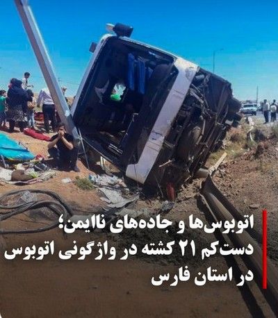 این یکی از مرگبارترین تصادفهای جادهای در سالهای گذشته در ایران استدر یکی از مرگبارترین تصادفهای جادهای در ایران، حادثه واژگونی یک دستگاه اتوبوس مسافربری در محور کَوار به فیروزآباد در استان فارس ۲۱ کشته بر جای گذاشت.در این حادثه که صبح روز شنبه، ۲۸ تیرماه، رخ داد، ۳۴ نفر نیز مصدوم شدهاند.
