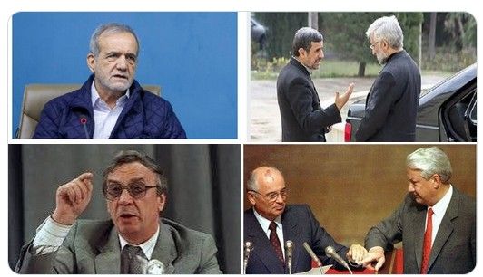 او ایران ۱۴۰۴ را مشابه شوروی ۱۹۹۱، جلیلی را یانایف، پزشکیان را گورباچف و خود را یلتسین می‌بیند و منتظر است، جلیلی علیه پزشکیان بشورد تا او مانند یلتسین به میدان بیاید و قدرت را تصاحب کند؛ خطای محاسبه احمدی‌نژاد اما ندیدن نقش رهبری است.