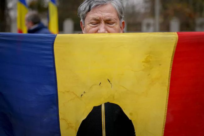 مردی پرچم ۱۹۸۹ رومانی را در گورستان «قهرمانان» بخارست در دست گرفته استسقوط چائوشسکو