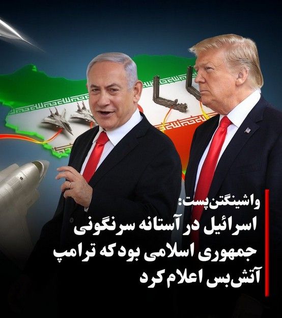 حمله اسرائیل به ایرانالعربیه: روزنامه واشینگتن پست جمعه شب سوم مرداد (به وقت شرق آمریکا)، به نقل از منابع خود نوشت که اسرائیل در روز پایانی جنگ 12روزه با ایران مرحله سرنگونی حکومت جمهوری اسلامی را آغاز کرده بود اما ترامپ به نتانیاهو فشار آورد تا با آتشبس اعلام شده از سوی او، موافقت کند.در این مقاله به نوشته «دیوید ایگناتیوس» از قول منابع آن آمده است: ترامپ در حالی آتشبس اعلام کرد که «بنا بر این گزارشها اسرائیل در حال ورود به فاز نهایی حملات با هدف سرنگونی رژیم بود.»
