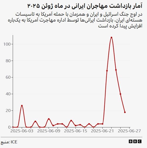 در حالی که در ۲۰ روز اول ماه ژوئن تنها ۷۶ ایرانی بازداشت شده بودند، در چهار روزِ بعد از حمله آمریکا به تاسیسات هستهای ایران تعداد این بازداشتیها به ۳۰۳ نفر رسید. ماه ژوئن رکورددار بازداشت ایرانیان در سال ۲۰۲۵ توسط پلیس مهاجرت شد.