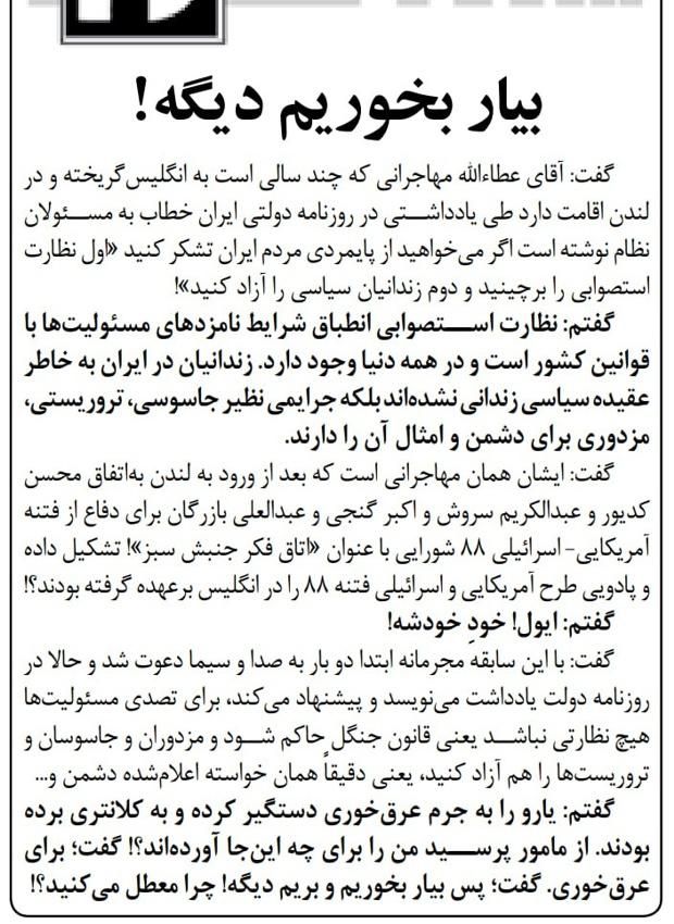 گفت: آقای عطاءالله مهاجرانی که چند سالی است به انگلیسگریخته و در لندن اقامت دارد طی یادداشتی در روزنامه دولتی ایران خطاب به مسئولان نظام نوشته است اگر میخواهید از پایمردی مردم ایران تشکر کنید «اول نظارت استصوابی را برچینید و دوم زندانیان سیاسی را آزاد کنید»!