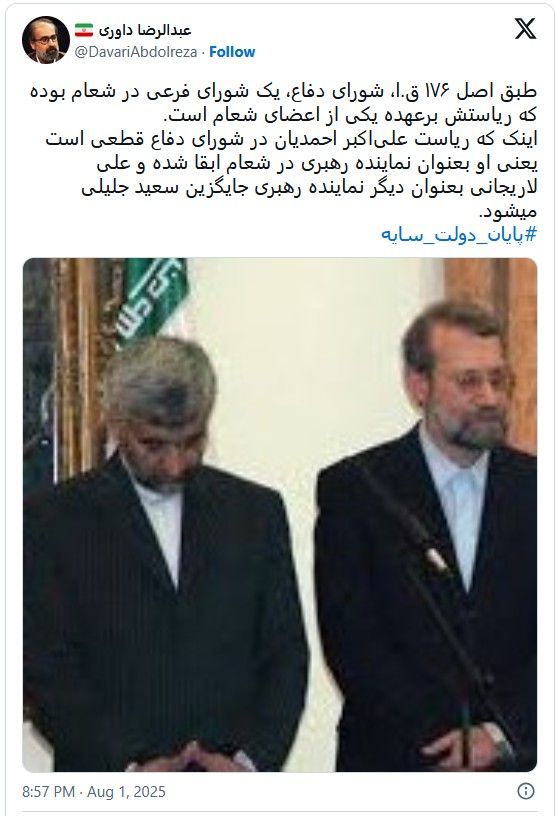 عبدالرضا داوری، پژوهشگر اقتصاد سیاسی و مشاور سابق محمود احمدینژاد، رئیسجمهوری پیشین ایران روز جمعه در شبکه اجتماعی ایکس نوشت: «طبق اصل ۱۷۶ قانون اساسی، شورای دفاع، یک شورای فرعی در شورای عالی امنیت ملی بوده که ریاستش برعهده یکی از اعضای شورای عالی امنیت ملی است. اینک که ریاست علیاکبر احمدیان در شورای دفاع قطعی است یعنی او بعنوان نماینده رهبری در شورای عالی امنیت ملی ابقا شده و علی لاریجانی به عنوان دیگر نماینده رهبری جایگزین سعید جلیلی میشود.»