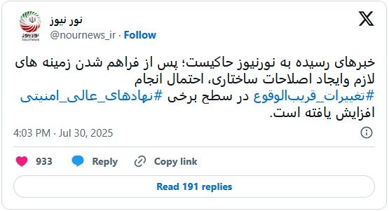 این گزارش درحالی منتشر میشود که نور نیوز، رسانه نزدیک به شورای عالی امنیت ملی دو روز پیش از افزایش احتمال «تغییرات قریبالوقوع در سطح برخی از نهادهای عالی امنیتی» خبر داده بود.