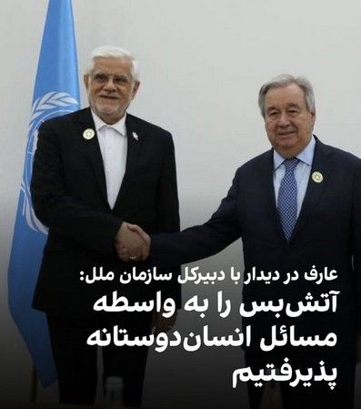 عارف همچنین با اشاره به وضعیت غزه به گوترش گفت: «اگر سازمان ملل اقدام شایستهتری انجام داده بود، امروز شاهد این اتفاقات و فجایع در فلسطین و غزه نبودیم.»