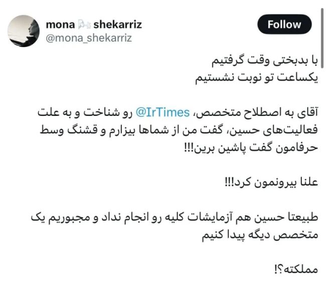 در ادامه، همسر این فرد نیز در پستی جداگانه، مدعی شد پزشک معالج پس از اطلاع از گرایش سیاسی همسرش، از معاینه کامل خودداری کرده و این اتفاق پس از دو ساعت انتظار در درمانگاه رخ داده است.