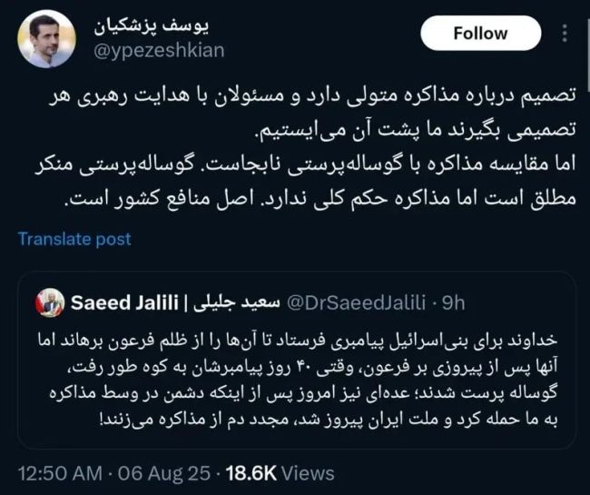 واکنش یوسف پزشکیان، پسر رئیس جمهور ایران به سعید جلیلی: «تصمیم درباره مذاکره متولی دارد»مقایسه به پناهگاه رفتن خامنهای با «کوه طور رفتن موسی»در میان واکنشها به این مثال آقای جلیلی، برخی هم اینطور برداشت کردند که منظور از غیبت حضرت موسی و رفتن او به کوه طور، کنایه به غیبت آیتالله خامنهای طی جنگ ۱۲ روزه است و به آن واکنش نشان دادند.