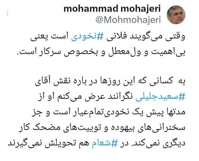 یاشار سلطانی، روزنامهنگار در شبکه ایکس سعید جلیلی را «فریبکار» خوانداز«نخودی تمامعیار» خواندن سعید تا یادآوری«آغل» وحید جلیلیمحمد مهاجری، روزنامهنگار اصولگرا و عضو هیئت سردبیری خبرآنلاین، در شبکه ایکس سعید جلیلی را یک «نخودی تمام عیار» خواند و نوشت: «وقتی می گویند فلانی نخودی است یعنی بیاهمیت و ول معطل و بخصوص سرکار است. به کسانی که این روزها در باره نقش آقای سعیدجلیلی نگرانند عرض می کنم او از مدتها پیش یک نخودی تمام عیار است و جز سخنرانیهای بیهوده و توییتهای مضحک، کار دیگری نمیکند. در شعام [شورای عالی امنیت ملی] هم تحویلش نمیگیرند.»