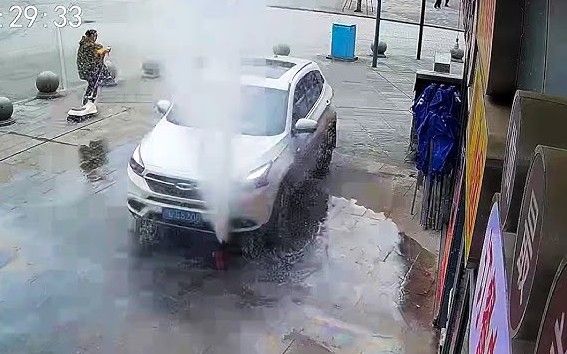 این شیر اضطراری آب که در وسط یک پیادهروی سنگفرش شده مقابل یک مغازه محلی قرار دارد، چندین بار هدف برخورد قرار گرفته است. هر برخورد باعث آسیب به خودرو و شیر آتشنشانی و جاری شدن آب از محل شکسته شده است.