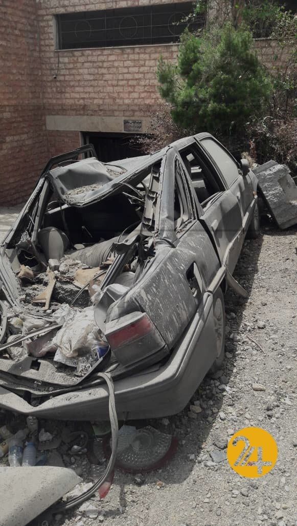 جلوی مجتمع چند اتومبیل پارک شده که به شدت آسیب دیدهاند از برخی تنها یک ورق فولادی جمع شده در میان انبوهی از خاک و شیشه خرده باقی مانده.