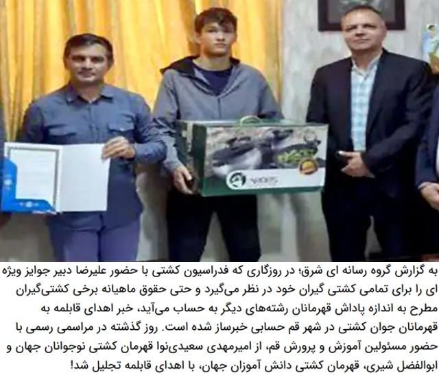 هنر نمایی مدیران وطنی این بار برای مدال آوران ملی نه سکه بود و نه هدیه نقدی. مدیران شاخص استان با تلاش شبانه روزی و زحمات طاقت فرسای خود توانستند از نام آوران تیم ملی به عالی ترین شکل ممکن قدردانی کرده و در یک برنامه ی زنده ی تلویزیونی یک قابلمه را به کشتی گیر فرنگی هدیه دهند.