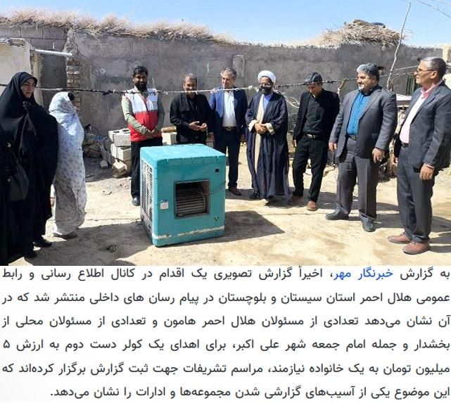 از مراسم رسمی اهدای «کولر آبی دست دوم» به یک نیازمند تا اهدای جعبه چیپس به خبرنگاران