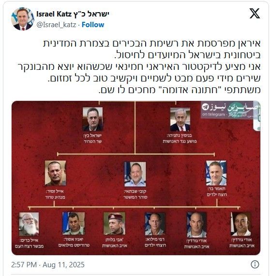 آقای کاتس ضمن بازنشر این تصویر در شبکه اجتماعی ایکس، علی خامنهای، رهبر جمهوری اسلامی ایران را تهدید به ترور کرد.