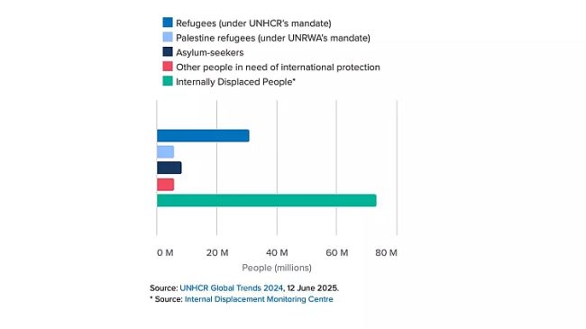 به گزارش کمیساریای عالی پناهندگان سازمان ملل متحد جمعیت جهانی پناهندگان، از جمله افرادی که نیاز به حمایت بین‌المللی دارند، در سال ۲۰۲۴ به نزدیک به ۴۲.۷ میلیون نفر رسیده است.
