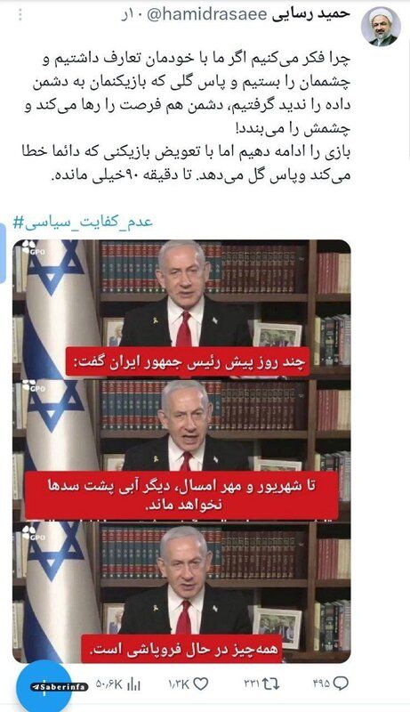 حمید رسایی در صفحه ایکس خود با انتشار تصاویر نتانیاهو نوشت : چرا فکر می‌کنیم اگر ما با خودمان تعارف داشتیم و چشممان را بستیم و پاس گلی که بازیکنمان به دشمن داده را ندید گرفتیم، دشمن هم فرصت را رها می‌کند و چشمش را می‌بندد!