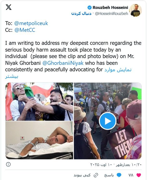 I am writing to address my deepest concern regarding the serious body harm assault took place today by an individual (please see the clip and photo below) on Mr. Niyak Ghorbani @GhorbaniiNiyak who has been consistently and peacefully advocating for… pic.twitter.com/5AT8LQ7y78