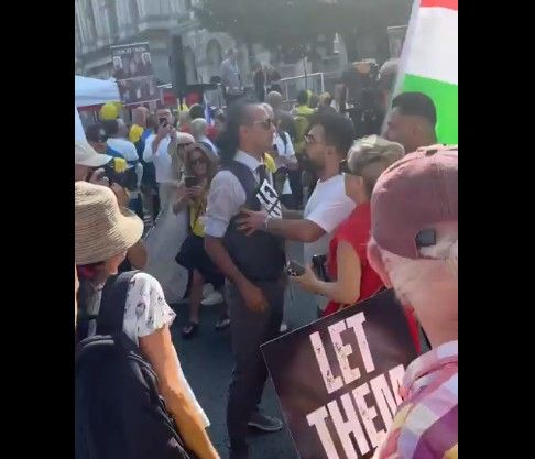 امروز برای جلب توجه جامعه جهانی و سیاستمداران انگلستان به ضرورت آزادی هرچه سریعتر تمام گروگانهای در دست تروریستهای حماس از جمله ایویاتار داوید، که حماس او را مجبور به کندن قبر خودش کرده بود، و روم براسلاوسکی، که از شدت گرسنگی توان نفس کشیدن نداشت به دعوت دوستانم در@StopTheHate_UK، در خط اول راهپیمایی و در کنار شخصیتهای برجستهای همچون Chief Rabbi Ephraim Mirvis انگلستان و بسیاری دیگر حضور داشتم. وقتی به مقابل استیج رسیدیم، وارد منطقهای شدم که درست روبهروی استیج بود.