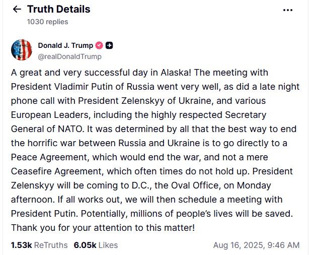 او در مورد نشست آلاسکا و گفت‌وگوهای تلفنیِ پس از آن با زلنسکی و رهبران اروپایی هم نوشت: «همه بر این نظر بودند که بهترین راه برای پایان دادن به جنگ هولناک میان روسیه و اوکراین، رفتن مستقیم به سمت یک توافق صلح است؛ توافقی که به جنگ پایان دهد، نه صرفاً توافق آتش‌بس که اغلب پایدار نمی‌ماند».