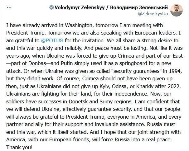 زلنسکی در آستانه دیدارش با ترامپ گفته است: «همه ما خواستار پایان سریع و مطمئن این جنگ هستیم و صلح باید پایدار باشد، نه مانند سالهای گذشته که اوکراین مجبور شد کریمه و بخشی از شرق خاک خود و دونباس را واگذار کند.»