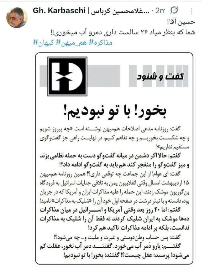 کرباسچی، مدیر مسئول روزنامه هممیهن با انتشار تصویر این مطلب در شبکه اجتماعی ایکس نوشت: «حسین آقا! شما که بنظر میاد ۳۶ سالست داری دمرو آب میخوری!!»گفتنی است ، روزنامه کیهان روز یکشنبه در ستون گفت و شنود خود نوشت: