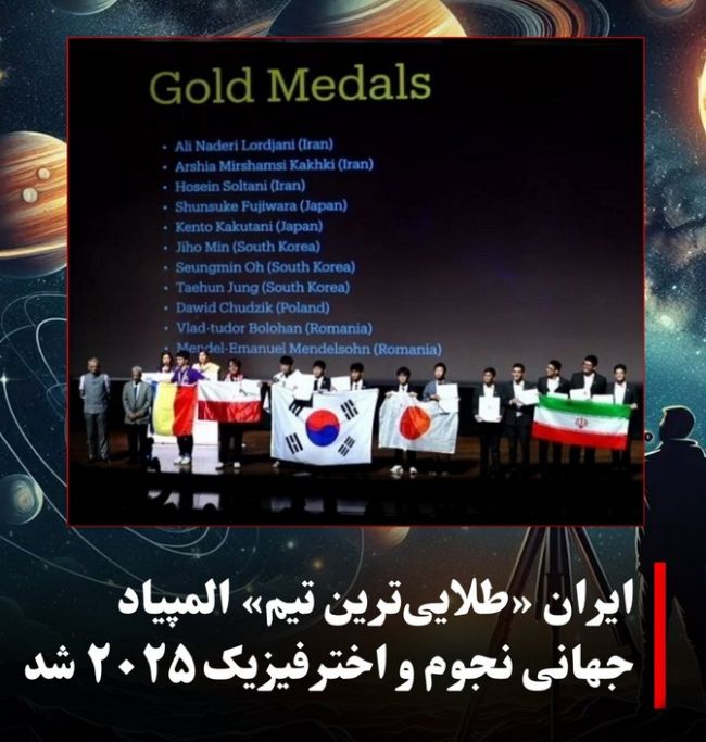 ایران«طلایی‌ترین تیم» المپیاد جهانی نجوم  و اختر فیزیک ۲۰۲۵ شدتیم المپیاد نجوم و اخترفیزیک ایران در رقابت‌های جهانی ۲۰۲۵ که در شهر بمبئی هند برگزار شد، عنوان «طلایی‌ترین تیم» را به دست آورد.