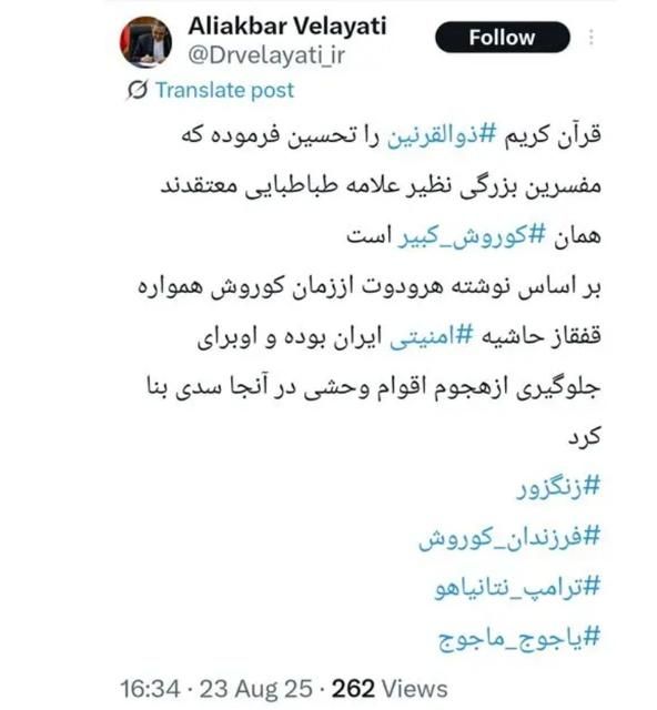 او از هشتگ‌های «یاجوج-ماجوج» و «ترامپ-نتانیاهو» استفاده کرد و روایت قرآنی «ذوالقرنین» را همان «کوروش کبیر» دانست.