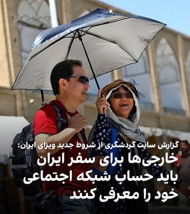 ایران اینترنشنال: وب‌سایت «تراول اَند تور ولد»، رسانه حوزه گردشگری جهانی، گزارش داد وزارت خارجه جمهوری اسلامی مقررات سختگیرانه‌‌ای اعمال کرده که طبق آن، سفر انفرادی گردشگران خارجی ممنوع شده و متقاضیان باید مدارکی از جمله مشخصات صفحات رسانه‌های اجتماعی خود را برای دریافت ویزای ایران ارائه دهند.