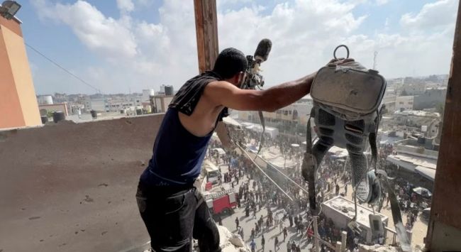 مردی در حالی که تجهیزات مورد استفاده حسام المصری، فیلمبردار طرف قرارداد خبرگزاری رویترز، را در دست دارد، به مرگ او، دیگر روزنامه‌نگاران و مردم در حملات اسرائیل به بیمارستان ناصر، واکنش نشان می‌دهدرادیو فردا: مقام‌های درمانی در نوار غزه اعلام کردند که اسرائیل روز دوشنبه سوم شهریور با دو موشک به بیمارستان اصلی جنوب غزه حمله کرد و دست‌کم ۲۰ نفر از جمله پنج روزنامه‌نگار را کشت.