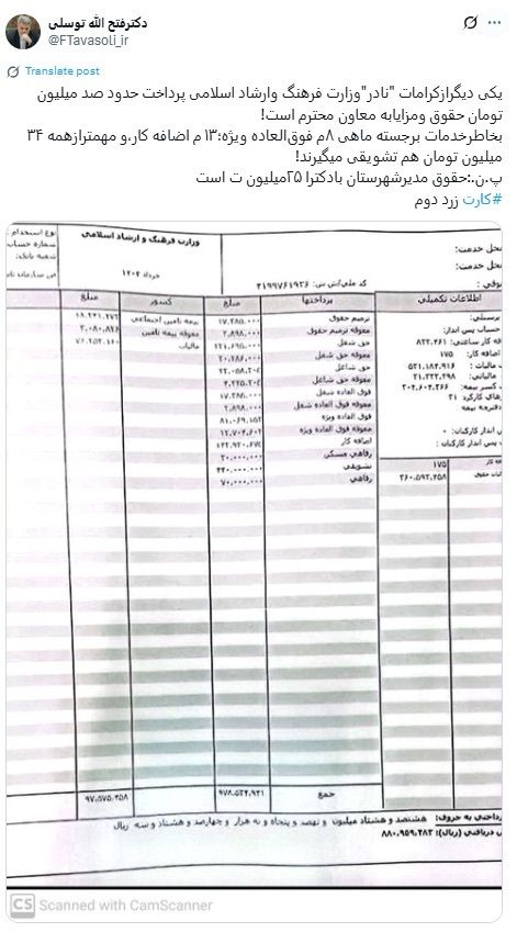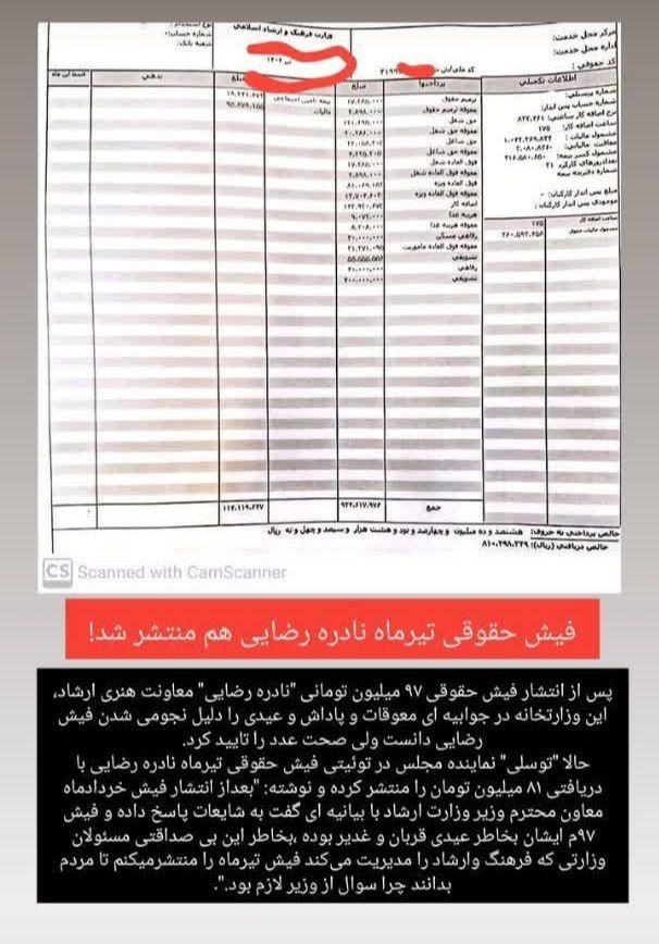 حالا توسلی نماینده مجلس در توئیتی فیش حقوقی تیرماه نادره رضایی با دریافتی 81 میلیون تمان را منتشر کرده و نوشته : بعد از انتشار فیش خرداد ماه معاون محترم وزیر وزارت ارشاد با بیانیه‌ای گفت به شایعات پاسخ داده و فیش 97 میلیونی ایشان بخاطر عیدی قربان و غدیر بوده، بخاطر این بی صداقتی مسولات وزارتی که فرهنگ و ارشاد را مدیریت می کند فیش تیرماه را هم متش میکنم تا مردم بدانند چرا سئوال از وزیر لازم یود