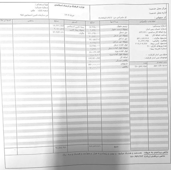 به گزارش تابناک به نقل از فارس، تصویر فیش حقوقی منتسب به یکی از معاونین وزارت فرهنگ و ارشاد منتشر شده که میزان حقوق آن را ۹۷ میلیون تومان نشان می‌دهد.