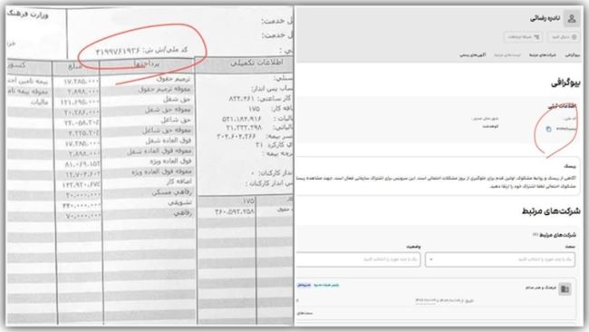 بررسی کد ملی موجود در فیش منتشر شده با کدملی نادره رضایی در سامانه رسمیو ارتباط میان فیش یکصد میلیون تومانی و نادره رضایی را تأیید می‌کند.