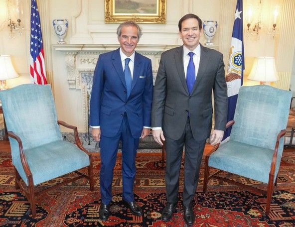 وزیر خارجه آمریکا روز چهارشنبه ۵ شهریور (۲۷ اوت) با مدیر کل آژانس بینالمللی انرژی اتمی در واشنگتن دیدار کرد. به گفته وزارت امور خارجه آمریکا مارکو روبیو و رافائل گروسی در مورد "امنیت هستهای جهانی از جمله در تأسیسات هستهای اوکراین و همچنین تلاشهای آژانس برای انجام فعالیتهای نظارتی و راستیآزمایی از جمله در ایران" با یکدیگر گفتوگو کردند.