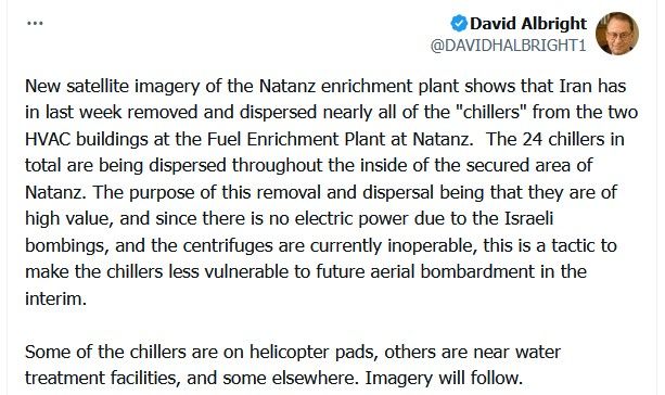 آقای آلبرایت در شبکه اجتماعی ایکس نوشت: «تصاویر ماهوارهای جدید از تأسیسات غنیسازی نطنز نشان میدهد که ایران طی هفته گذشته تقریباً تمام «چیلرها» را از دو ساختمان تهویه (HVAC) در مجتمع سوخت نطنز خارج کرده و آنها را پراکنده کرده است. در مجموع ۲۴ دستگاه چیلر درون محدوده حفاظتشده نطنز توزیع شدهاند.»