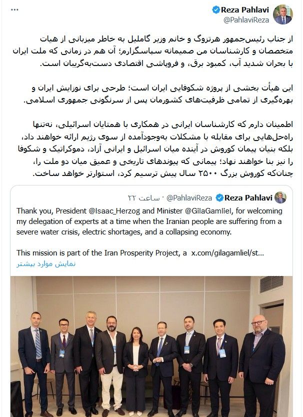 او در این پیام نوشت:«از جناب رییسجمهور هرتزوگ و خانم وزیر گملیل به خاطر میزبانی از هیات متخصصان و کارشناسان من صمیمانه سپاسگزارم؛ آن هم در زمانی که ملت ایران با بحران شدید آب، کمبود برق، و فروپاشی اقتصادی دستبهگریبان است. این هیات بخشی از پروژه شکوفایی ایران است؛ طرحی برای نوزایش ایران و بهرهگیری از تمامی ظرفیتهای کشورمان پس از سرنگونی جمهوری اسلامی.»