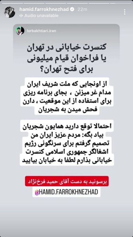 استوری حمید فرخنژاد: کنسرت خیابانی یا قیام برای فتح تهران!