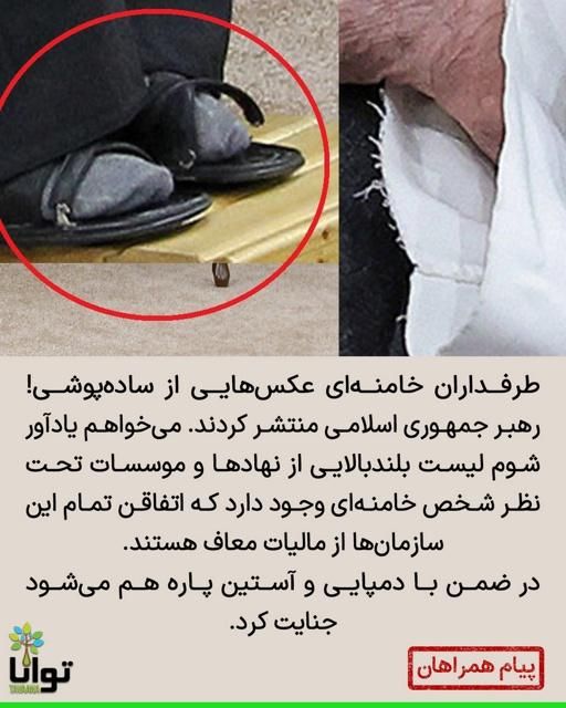پیام ارسالی از "همراهان" سایت توانا«طرفداران خامنهای عکسهایی از سادهپوشی! رهبر جمهوری اسلامی منتشر کردند. میخواهم یادآور شوم لیست بلندبالایی از نهادها و موسسات تحت نظر شخص خامنهای وجود دارد که اتفاقن تمام این سازمانها از مالیات معاف هستند.