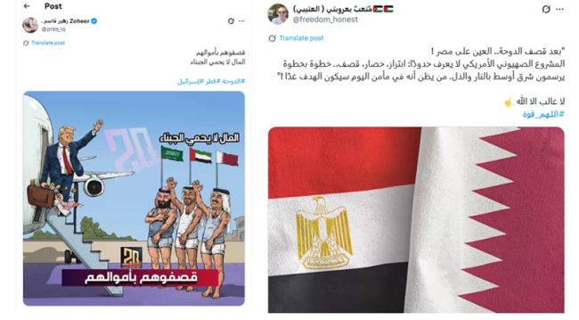 یک کاربر اردنی نوشت که «پس از حمله به دوحه، همه نگاهها به مصر است» و هشدار داد که «پروژه صهیونیستی ـ آمریکایی حد و مرزی نمیشناسد: باجخواهی، محاصره، بمباران... آنها گام به گام در حال شکلدادن خاورمیانهای با آتش و ذلت هستند». او افزود: «هر کس امروز خود را امن بداند، فردا هدف خواهد بود!»
