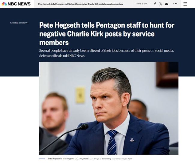 دو مقام دفاعی به "ان بی سی" گفتند که پیت هگست، وزیر جنگ آمریکا به فرماندهان پنتاگون گفته است که هر یک از اعضای ارتش را که ترور چارلی کرک، فعال محافظهکار، را مسخره یا تایید کردهاند، شناسایی کنند تا مجازات شوند.