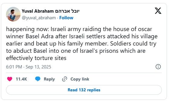 یووال آبراهام، روزنامهنگار اسرائیلی که به همراه باسل عدرا مستند «جز این سرزمین، جایی نیست» را ساخته، میگوید: «آنچه امروز در روستای او اتفاق افتاد، بارها تکرار شده است؛ ابتدا مهاجمان اسرائیلی با خشونت به روستای فلسطینی حمله میکنند، سپس ارتش میآید و فلسطینیان را هدف قرار میدهد.»