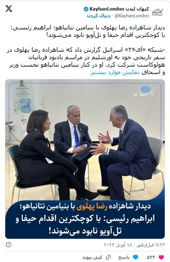 گیلا گاملیل وزیر سابق اطلاعات و وزیر کنونی علم، فناوری و فضای دولت سرائیل در دیدار با شهبانو فرح پهلوی و شاهزاده رضا پهلوی در پاریس، ابزار امیدواری کرد که به زودی چهره خاورمیانه تغییر کند و… pic.twitter.com/VwnM9p0czu