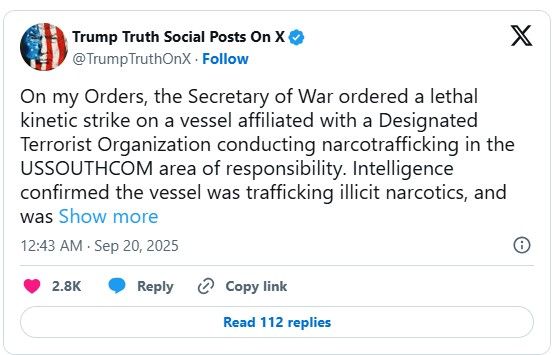 دونالد ترامپ، رئیس جمهوری آمریکا شامگاه جمعه ۲۸ شهریور (۱۹ سپتامبر) در شبکه اجتماعی خود "تروث سوشال"، اعلام کرد در عملیاتی که توسط ارتش این کشور انجام گرفته "سه تروریست مواد مخدر" کشته شدهاند.
