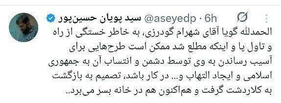 سید پویان حسین‌پور، معاون سابق سازمان فضای مجازی سراج، «خستگی راه و تاول پا و پیشگیری از سواستفاده دشمن» را دلیل بازگشت او دانست و نوشت: «الحمدلله گویا آقای شهرام گودرزی به خاطر خستگی از راه و تاول پا و اینکه مطلع شد ممکن است طرح‌هایی برای آسیب رساندن به وی توسط دشمن و انتساب آن به جمهوری اسلامی و ایجاد التهاب و… در کار باشد، تصمیم به بازگشت به کلاردشت گرفت و هم‌اکنون هم در خانه بسر می‌برد.»