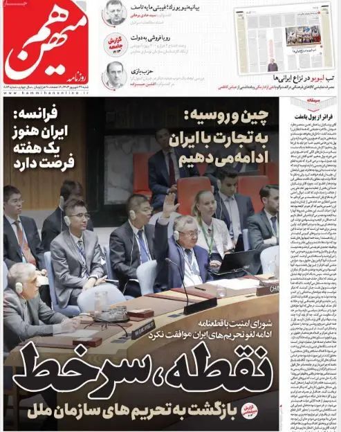 روزنامه هممیهن با تیتر «نقطه سر خط» به تصمیم شورای امنیت پرداخت و همچون دیگر روزنامههای تهران نوشت: «روند بازگشت تحریمهای بینالمللی علیه ایران به جریان افتاد. در صورتی که تحول خاصی حادث شود و توافقی میان ایران، آمریکا و اروپا به دست بیاید، در چند روز باقیمانده میتوان جلوی بازگشت قطعنامهها را گرفت.»روزنامه فرهیختگان با انتشار کاریکاتوری از امانوئل مکرون، رئیسجمهور فرانسه و با عنوان «سرویس یکطرفه» نوشت که به زعم این روزنامه سه کشور اروپایی سیاست اسرائیل را در برابر پرونده اتمی ایران عملی میکنند.