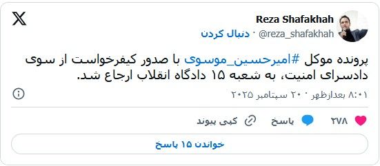 امیرحسین موسوی، معترض بازداشتشده با نام مستعار «جیمز بیدین»صدای آمریکا: برخی منابع خبری و حقوق بشری گزارش دادند پرونده امیرحسین موسوی که با نام مستعار «جیمز بیدین» در شبکههای اجتماعی فعالیت میکرد، پس از ۹ ماه بیخبری و بلاتکلیفی با اتهام «اقدام علیه امنیت ملی» و «اجتماع و تبانی» علیه جمهوری اسلامی به ابوالقاسم صلواتی در دادگاه انقلاب ارسال شده است.رضا شفاخواه، وکیل امیرحسین موسوی، زندانی سیاسی، در شبکه اجتماعی ایکس اعلام کرد که پرونده موکلش با صدور کیفرخواست از دادسرای امنیت به شعبه ۱۵ دادگاه انقلاب اسلامی تهران فرستاده شد.