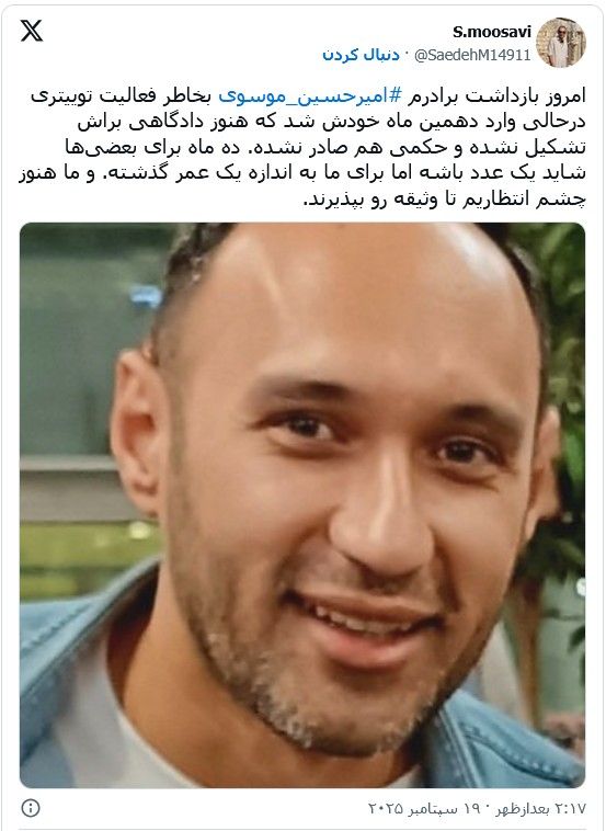 یک روز پیش از اعلام خبر ارجاع پرونده امیرحسین موسوی به شعبه پانزدهم دادگاه انقلاب، خواهر این زندانی سیاسی با اعلام این که بازداشت او «وارد دهمین ماه» شد، در شبکه اجتماعی ایکس نوشت که هرچند «۱۰ ماه برای بعضیها شاید یک عدد باشد، اما برای ما به اندازه یک عمر گذشته» است.