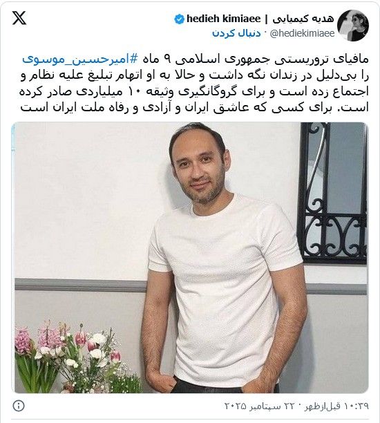 آقای موسوی از شهروندان مخالف جمهوری اسلامی و کاربران فعال در رسانههای اجتماعی بود که در پلتفرم ایکس با نام مستعار «جیمز بیدین» فعالیت میکرد و ۹ ماه گذشته را در بلاتکلیفی و بیخبری تحت بازداشت موقت گذراند.