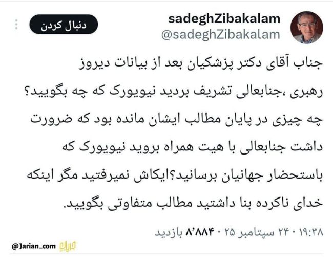 پُست‌های داغ امروز: زیباکلام به پزشکیان: بعد از بیانات رهبری چه ضرورتی برای سفر به نیویورک بود؟